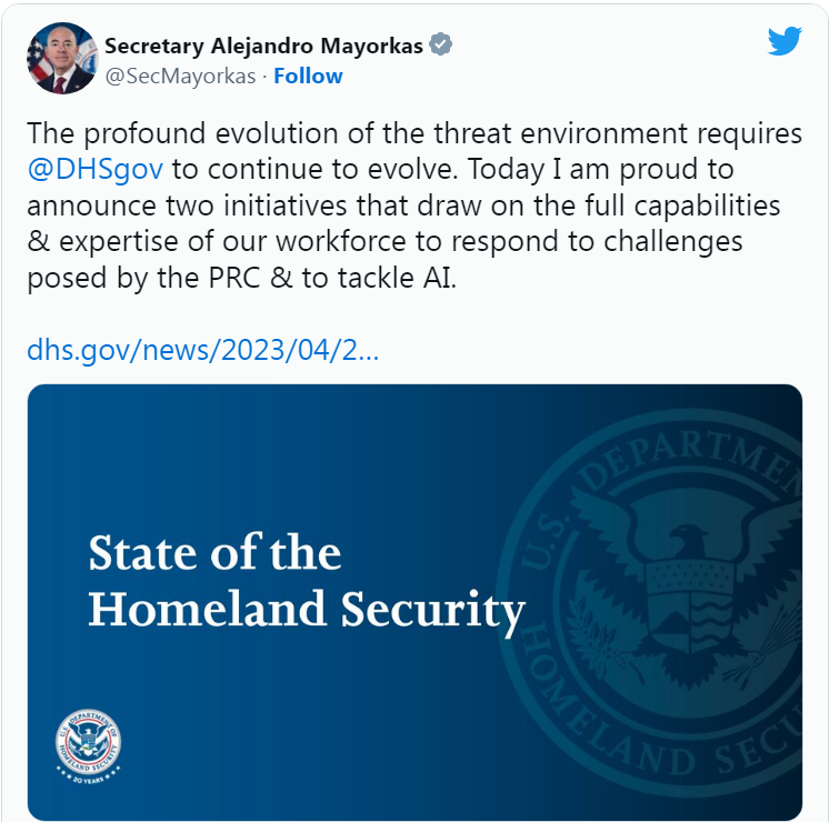 “Upravljam stvaranjem prve Radne skupine za umjetnu inteligenciju našeg Ministarstva koja će pokretati specifične primjene umjetne inteligencije za unaprjeđenje naših kritičnih misija domovinske sigurnosti”, rekao je Mayorkas u Vijeću za vanjske odnose.