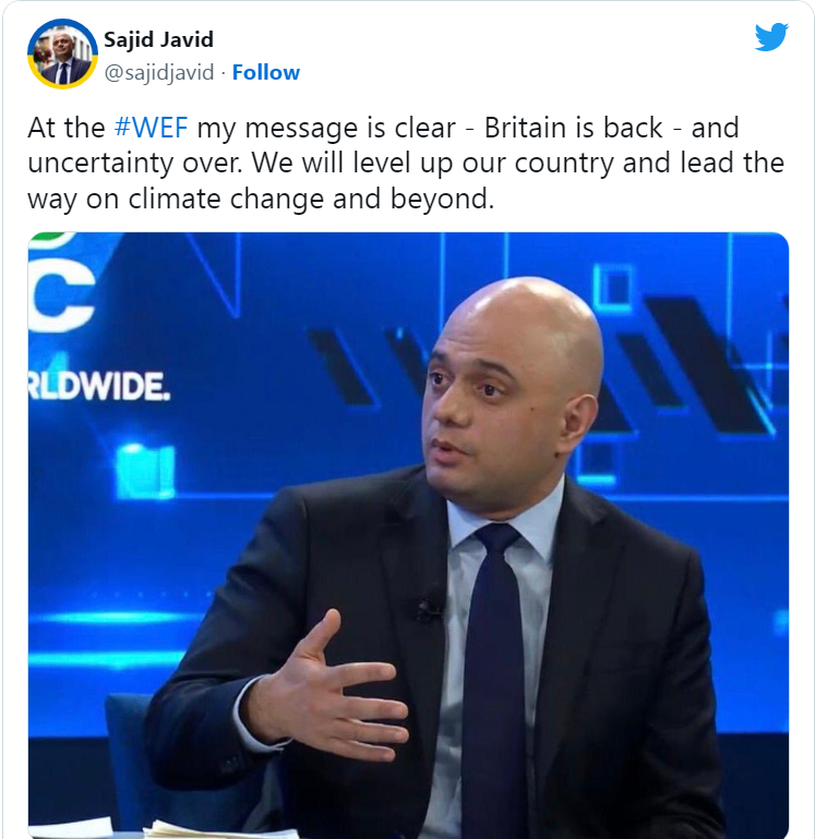 Također je “digitalni član” Svjetskog ekonomskog foruma. Unatoč tome što je tadašnji premijer Boris Johnson ministrima zabranio prisustvovanje, Javid je prisustvovao WEF-u u Davosu 2020.
