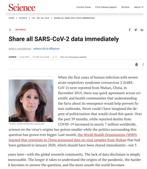 Maria van Kerkhove je američka iseljenica koja je otišla u Europu raditi poslijediplomski rad za ozloglašenog profesora Neila Fergusona – modelara katastrofe za svaku pandemiju u proteklih 20 godina koji nikada nije dobro shvatio – koji se nikada nije vratio kući, umjesto toga pronalazeći posao s tamnom stranom . Samo tri i više godine prekasno , ona predstavlja Svjetsku zdravstvenu organizaciju (“WHO”) u pozivu na objavljivanje više podataka o podrijetlu covida. Odmah! Možete li je zamisliti kako lupa nogom?