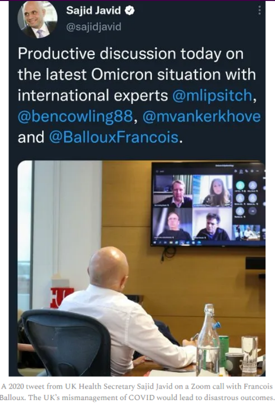 Trojica narativnih “stručnjaka” koje dr. Nass identificira također su savjetovali Sajida Javida, tadašnjeg ministra financija (2019.-2020.), a kasnije i državnog tajnika za zdravstvo i socijalnu skrb (2021.-2022.), u vezi s odgovorom na covid “pandemiju.”