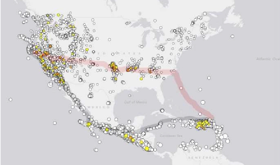 U Sjedinjenim Američkim Državama: “uz zaljevsku obalu istočno od rijeke Mississsipija, a na nekim područjima, čak na visini od 60 m, pronalazimo morske vrste karakteristične za ledeno doba.” U močvarama Michigana koje prekrivaju ledene naslage otkriveni su kosturi dvaju kitova. U Georgiji se morski talog pojavljuje na visini od 48 m, a u sjevernoj Floridi na visini od čak 73 m. U Teksasu, mnogo južnije od najudaljenijega područja zahvaćenoga wisconsinskim ledenim pokrivačem, u morskim su talozima pronađeni ostaci kopnenih sisavaca iz ledenoga doba. Morska obala sjeveroistočnih država te arktička obala Kanade prekriveni su morskim talogom punim morževa, tuljana i barem pet vrsta kitova. U mnogim područjima uz obalu Tihoga oceana i Sjeverne Amerike morske naslage iz ledenoga doba prostiru se “više od 320 km u unutrašnjost”. Sjeverno od jezera Ontarija, otprilike na 134 m nadmorske visine, pronađene su kitove kosti, a kostur kita otkriven je u Vermontu, otprilike 152 m iznad morske razine, te na području Montreala u Quebecu na gotovo 183 m nadmorske visine.