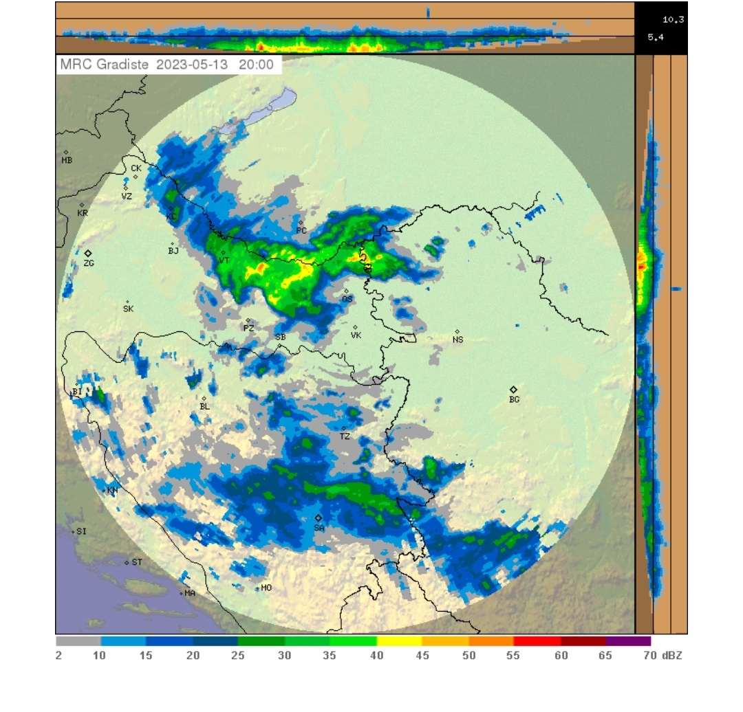 9. Kada padne prva veća tuča, u međuvremenu je pala u Krapinsko-zagorskoj, Koprivničko-križevačkoj, Sisačko-moslavačkoj i Zagrebačkoj županiji (7.5.), u Požeško-slavonskoj i Virovitičko-podravskoj županiji (12.5.) i ponovo u Virovitičko-podravskoj županiji (13.5.). – prethodni radarski i tekstualni prikazi.