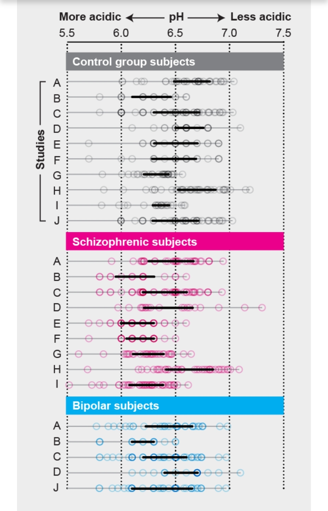 Takva su pitanja potaknula Tsuyoshija Miyakawu, neuroznanstvenika na Sveučilištu Fujita Health u Japanu, i njegove kolege da pretraže 10 postojećih skupova podataka iz obdukcija mozga više od 400 pacijenata sa shizofrenijom ili bipolarnim poremećajem. Njihov je cilj bio testirati svaku od vodećih teorija o povezanosti poremećaja kiselosti.