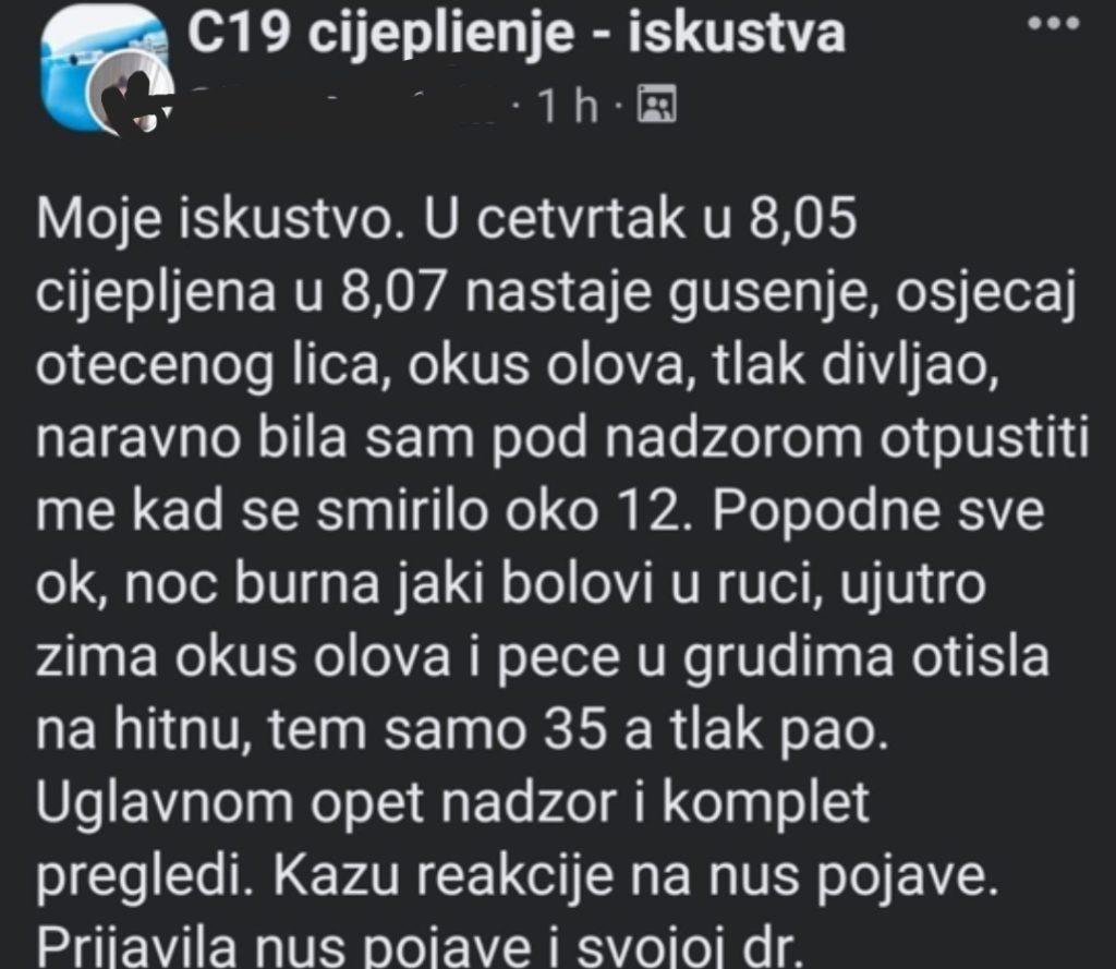Svjedočanstva pisana na grupi na Telegramu „Arna Šebalj – Svjedočanstva „cijepljenih“ u RH“ prenosim u originalu, bez dodatnih ispravaka te sa nadimcima ili inicijalima imena upisanima na grupi.