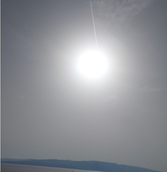 Vedro je , a sunce se vidi kao kad oboljeli gleda kroz mliječnu “mrenu” na oku. Ne trebaju vam naočale sa zatamnjenim staklima da bi mogli gledati direktno u sunce.