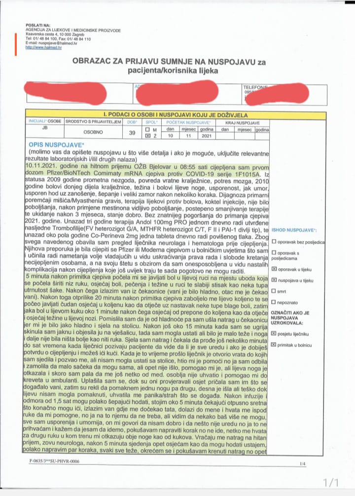 Kolegica mi je dala Vaš kontakt te Vam u privicima dopisa šaljem sken obrasca koji sam krajem 2021. godine poslala u HALMED radi sumnje na nuspojavu cjepiva protiv COVID-a Pfizer.