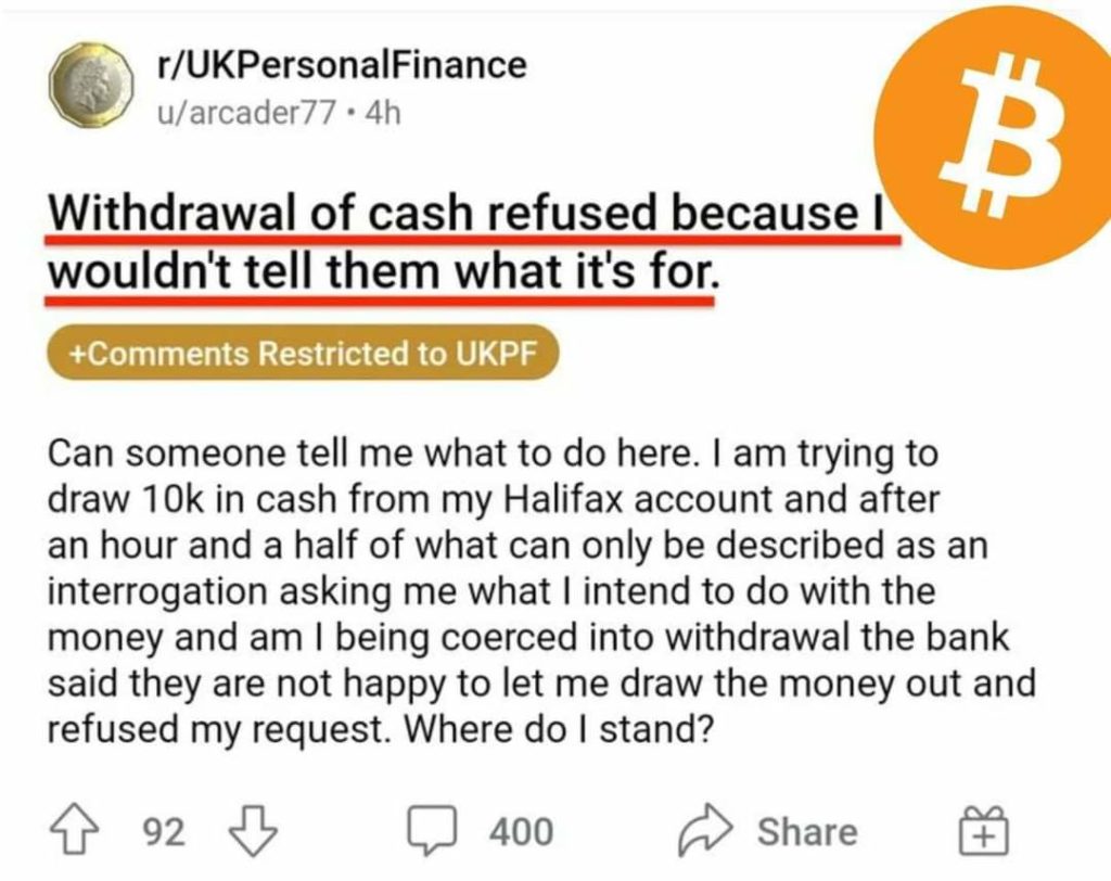 Prvi zvaničan slučaj klijenta Engleske banke “Halifax”, kome je banka odbila da isplati njegovih 10.000 funti, jer nije bila zadovoljna odgovorom “u koju svrhu će osoba potrošiti svoje novce”.