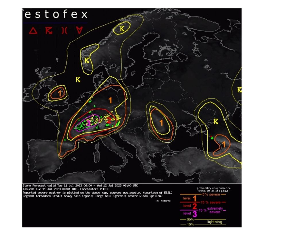 Evo jedne slike pojava od toga datuma u zapadnoj Europi. Sve ovo što vidite zeleno (trokuti i krugovi su pojave tuče i jake oborine), a žuto (slično slovu V) su pojave olujnog vjetra. Vidi se da ova žuta rubna linija za pojavu grmljavine zahvata dio zapadnog područja RH.