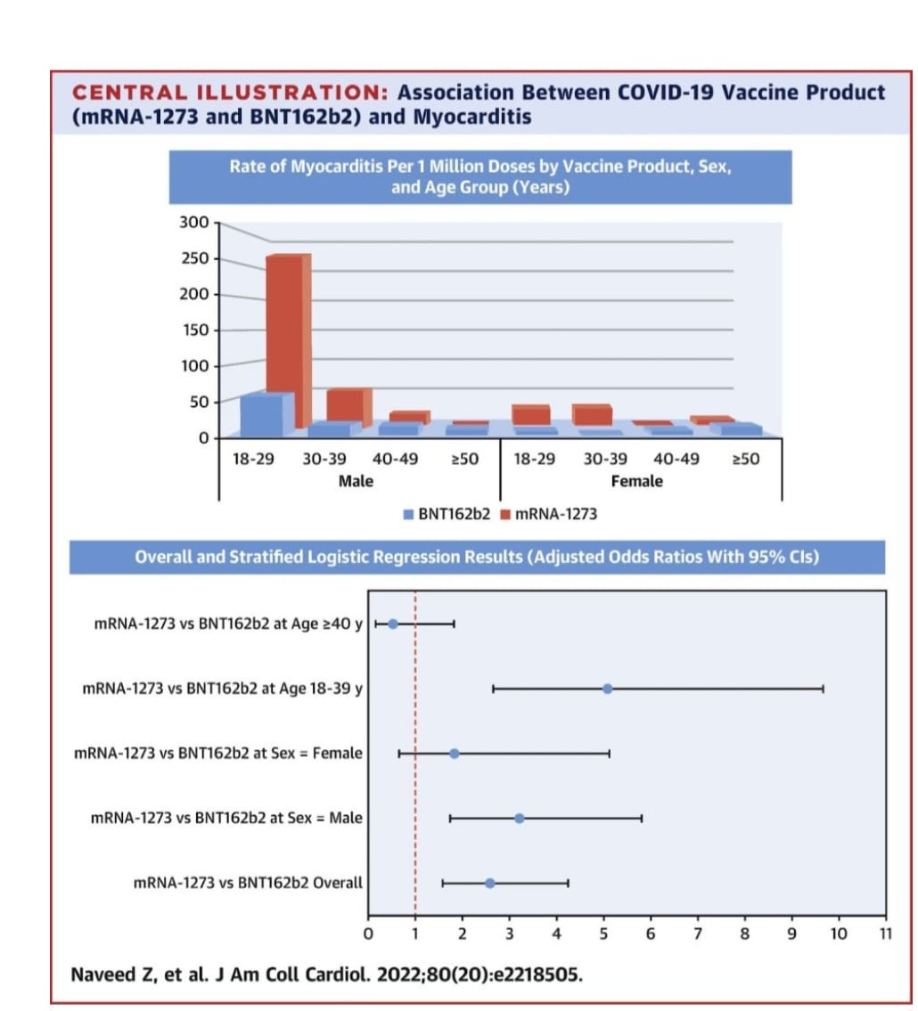U informativnom letku se ne spominje miokarditis, unatoč činjenici da je najviša dobna skupina za ovu ozbiljnu komplikaciju 16-17 godina, prema informacijama predstavljenim američkoj Agenciji za hranu i lijekove (FDA) s 69,1 slučajem po milijun sekundi doza u mužjaci. Drugi rad iz iste skupine dao je stopu od 105,9 na milijun doza. Ove studije temelje se na sustavima pasivnog izvješćivanja koji mogu podcijeniti pogođene brojke. U drugoj studiji iz Tajlanda u kojoj su dječaci vraćeni na krvne pretrage 3. i 7. dana nakon druge doze, klinički ili mogući subklinički miokarditis/perikarditis pronađen je u iznimno zabrinjavajućoj stopi od 1 na 43. Mnoga izvješća uključuju samo Pfizerovo cjepivo , koje je bilo prevladavajuće mRNA cjepivo u upotrebi, ali studija iz Kanade pokazuje da je incidencija miokarditisa nakon Moderne bila znatno veća nego nakon Pfizerovog cjepiva, posebno u mladih odraslih osoba u dobi od 18 do 29 godina, kao što je prikazano u nastavku.