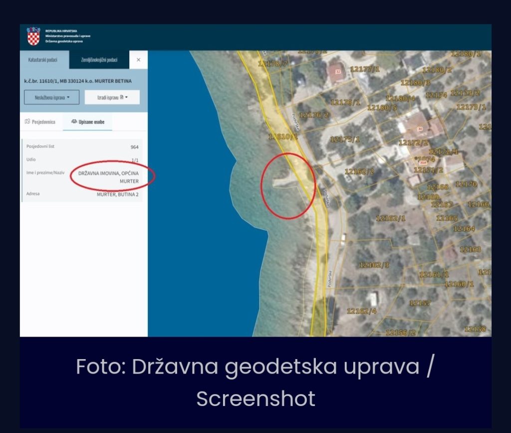 Poziva se i na katastarske čestice, koje uvidom u zemljišno-knjižne podatke naime pokazuju da se između njene čestice i mora nalazi pomorsko dobro, upisano kao “Državna imovina, Općina Murter”.