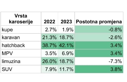 Različiti oblici karoserije automobila odražavaju različite potrebe. Neki vozači preferiraju manja hatchback vozila, dok se drugi odlučuju za prostranije opcije kao što su karavani ili SUV-ovi. Istraživanje koje je u Hrvatskoj provela tvrtka za automoto podatke carVertical pokazalo je da Hrvati preferiraju manje automobile i nisu toliko zainteresirani za vozila iz segmenata D i E.