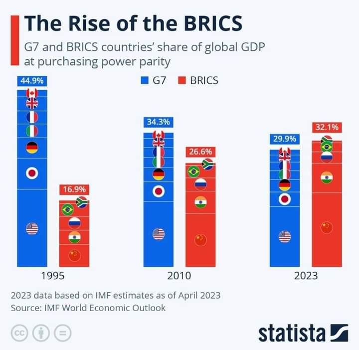 Jasna dinamika rasta ekonomske moći BRICS-a,u % svjetskog BDP-a/1994-2023…..