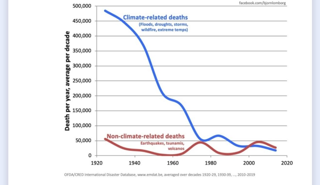 Slika 2: Broj smrtnih slučajeva povezanih s klimom pao je za više od 95% u prošlom stoljeću zbog sve većeg blagostanja! Politike ublažavanja čine suprotno jer uništavaju bogatstvo. Ulaganje u prilagodbu uvijek djeluje, bez obzira na uzroke klimatskih promjena.