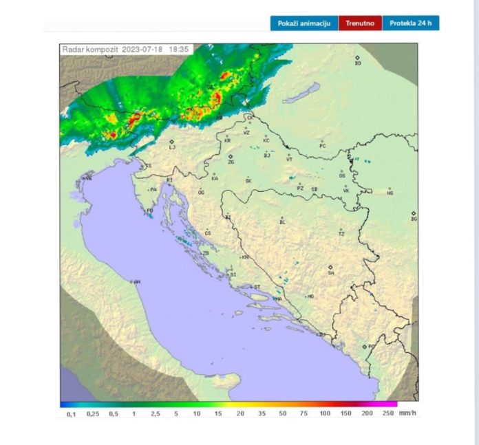 Fronta praćena jakim pljuskovima, tučom, vjetrovima te grmljavinom zahvatila je južnu Austriju i prilazi prema Sloveniji, a prema podacima Državnog hidrometeorološkog zavoda nevrijeme će pogoditi i Hrvatsku.