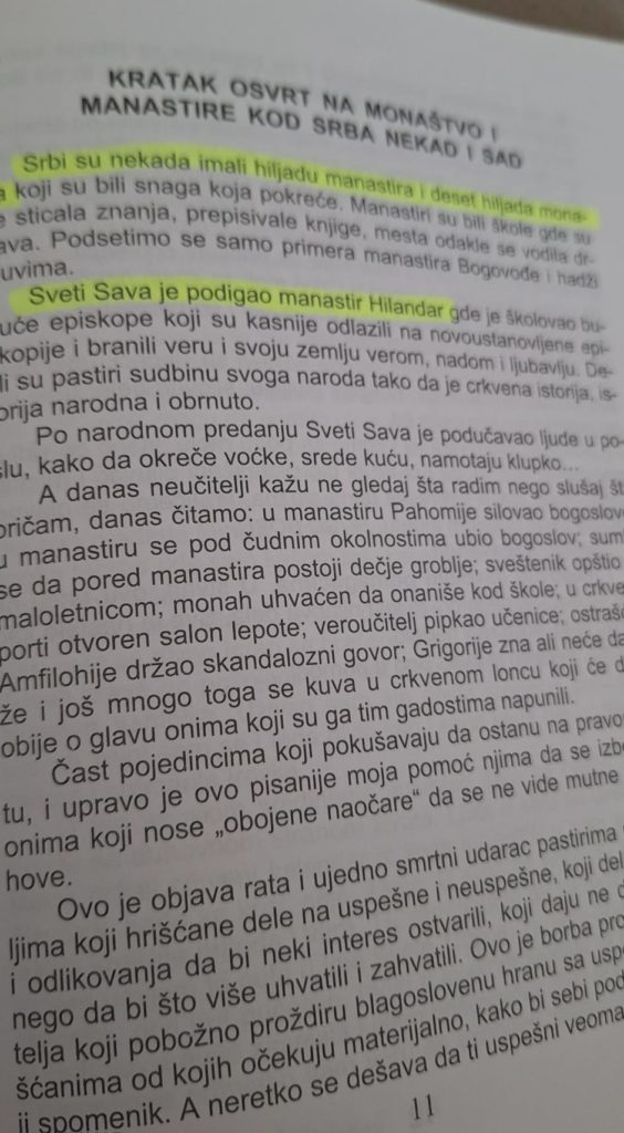 Ipak najveća provala u samoj knjizi je na tragu srpske mitomanije kako je u vrijeme svetog Save , podignut manastir Hilandar. Po toj “činjenici” neupitno je Sava živio preko tristo godina, jer je manastir podignut 300 godina prije njega…a tom genijalnom saznanju treba dodati i napisano kako su nekada davno Srbi imali 1000 crkava i 10 000 monaha…ovog se ne bi posramio niti Dobrica Ćosić?!