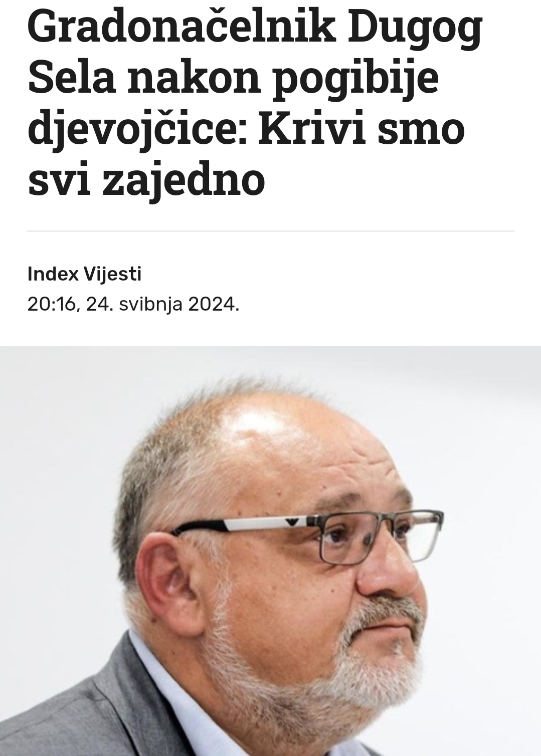 “OSMOGODIŠNJA djevojčica poginula je u prije tri dana u Dugom Selu nakon što je na nju naletio kamion. Mještani traže više prometnih policajaca na cesti, a pripremaju i veliki prosvjed iduće srijede u 19 sati ispred gradske uprave. Gradonačelnik Nenad Panian nije se ranije oglašavao, a sada je dao intervju za RTL.”