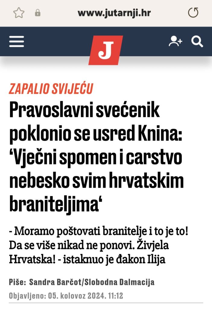 Prvi sam koji je ovdje ispred Srpske pravoslavne crkve. Nemam blagoslov da u ime Crkve predstavljam, ali dolazim u svoje ime i jesam dio Srpske pravoslavne crkve – kazuje nam đakon Ilija Čalina, rodom iz Like, koji sada živi u Zagrebu.”-piše Sandra Barčot za Slobodnu Dalmaciju, a slavodobitno prenosi Jutarnji list.