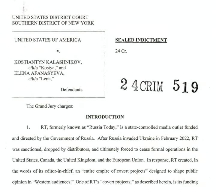 “Ministarstvo pravosuđa optužilo je dvoje zaposlenika RT-a, medijske kuće pod ruskom državnom kontrolom, u shemi vrijednoj 10 milijuna dolara za stvaranje i distribuciju sadržaja američkoj publici sa skrivenim porukama ruske vlade.” – rekao je državni odvjetnik Merrick B. Garland.