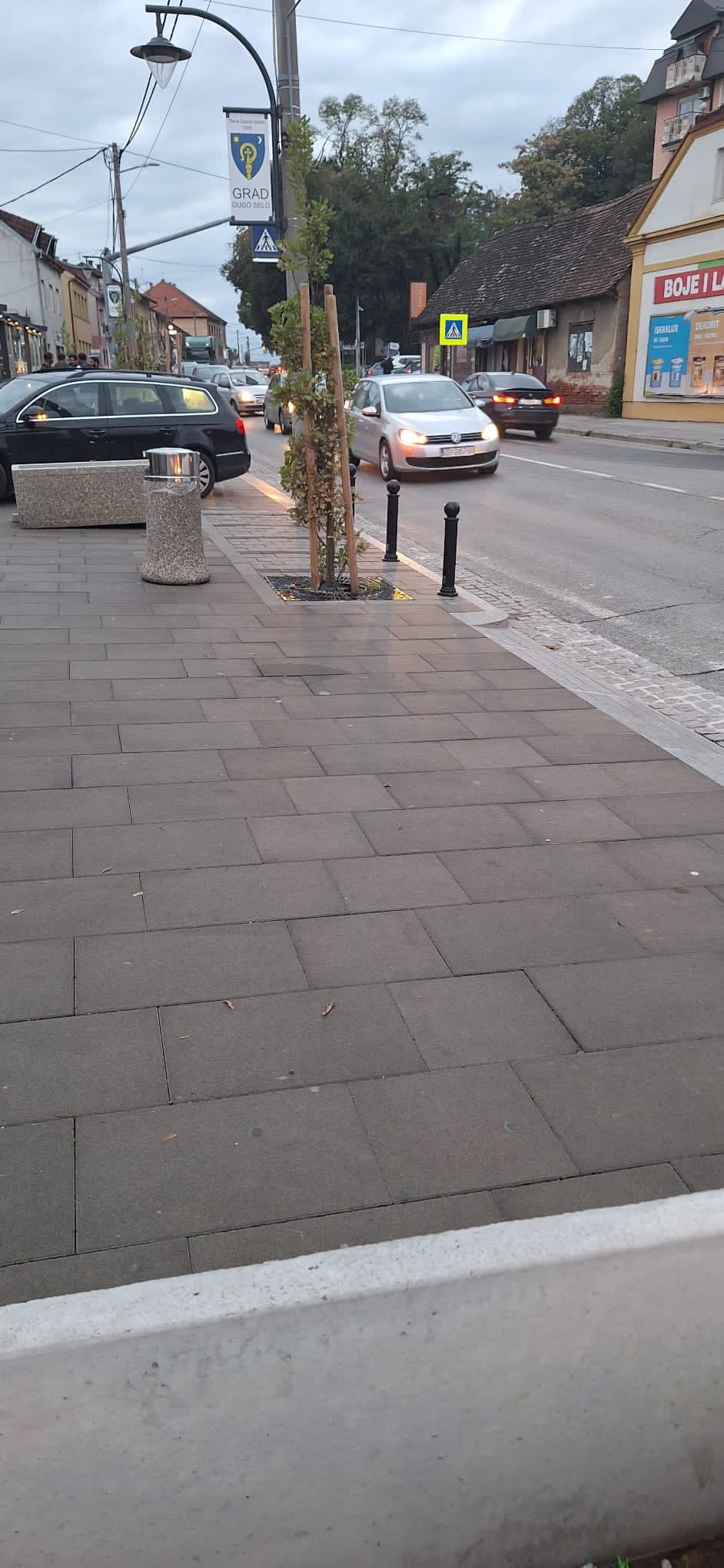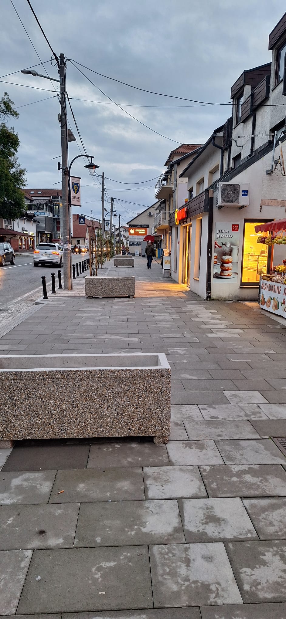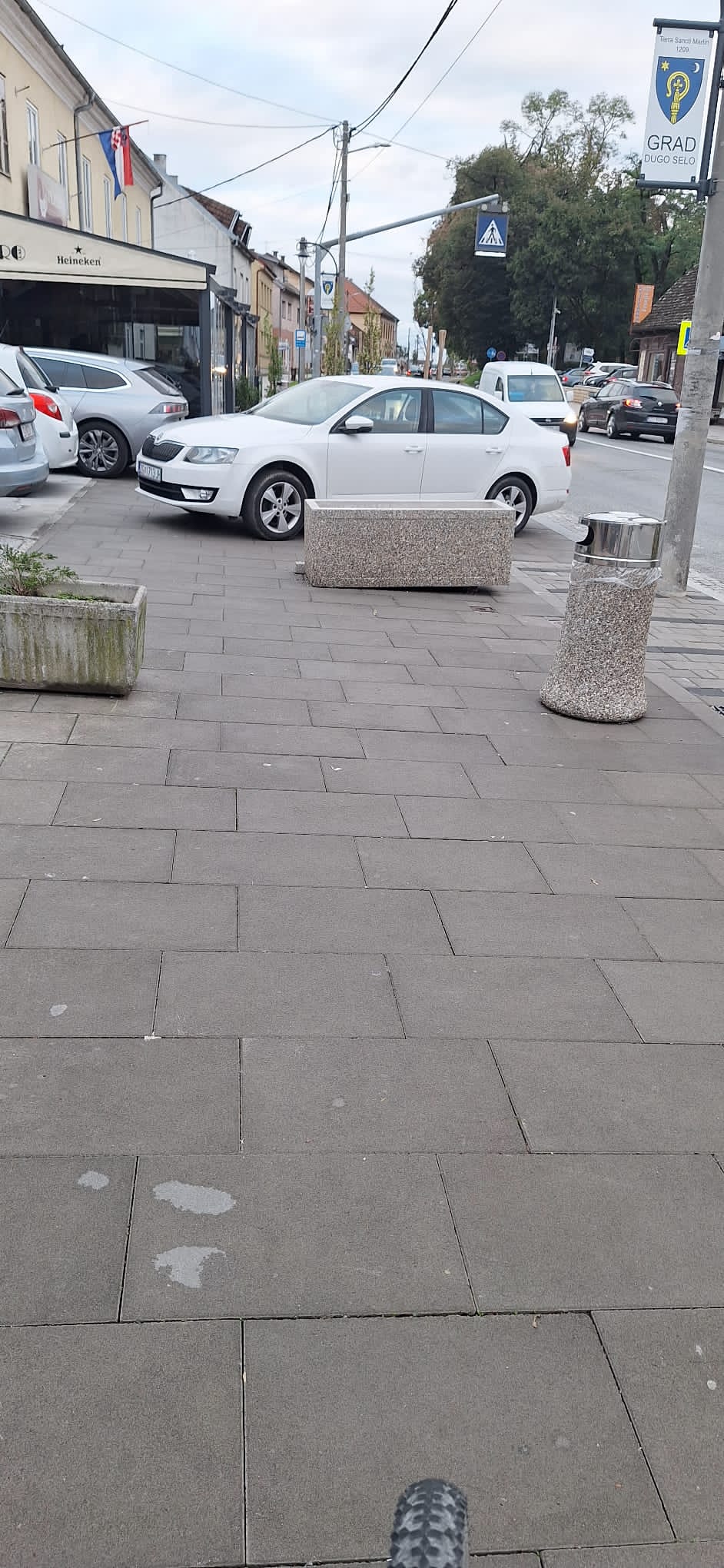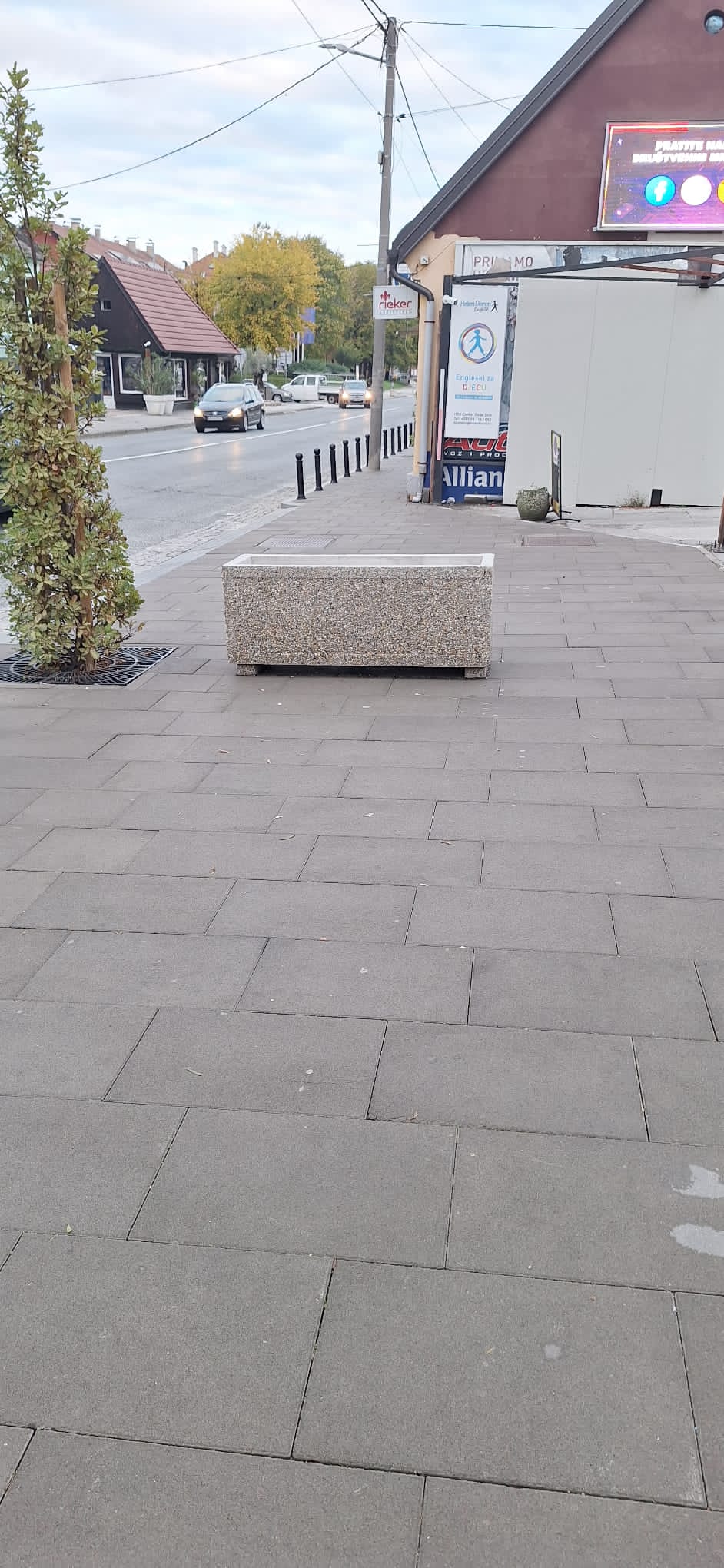 A u nastavku je fotografija ispred pekarnice, gdje je ta betonska grdosija, sada zamislite bicikle i osobu koja izlaze iz pekarnice, upravo ova betonska ” barikada ” stvara opasnu situaciju i ugrožava i pješaka i eventualno bicikle.