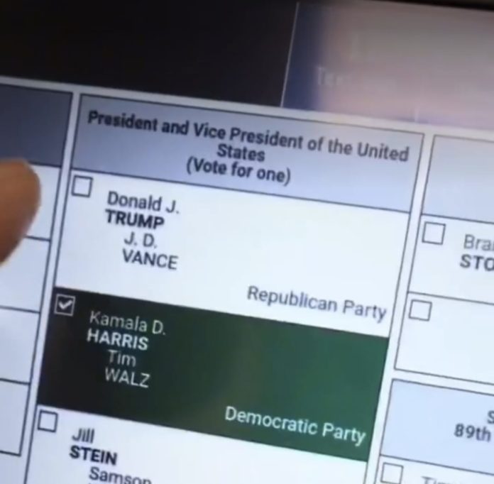 Dok čovjek nastavlja gurati Trump-Vance, glasački stroj umjesto toga bilježi glas za demokratsku listu Kamala Harris-Tim Walz.