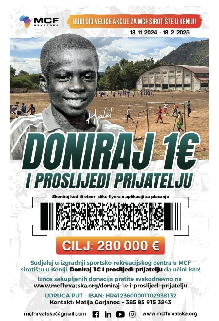 Sudjeluj u izgradnji sportsko-rekreacijskog centra u MCF sirotištu u Keniji kroz projekt Doniraj 1€ i proslijedi prijatelju da učini isto. Lančano želimo doseći 280 000 osoba koji mogu donirati po 1€.
