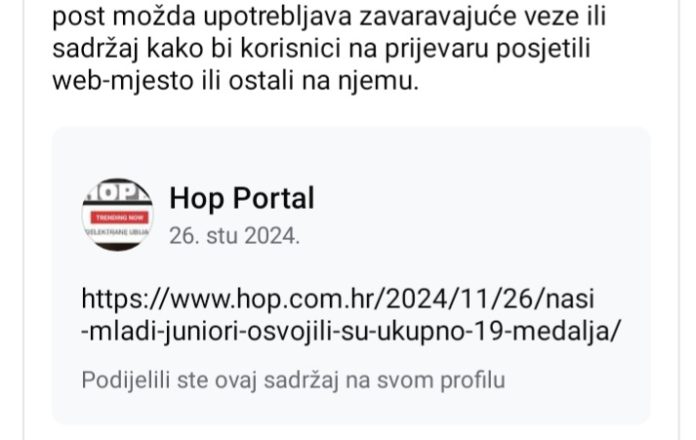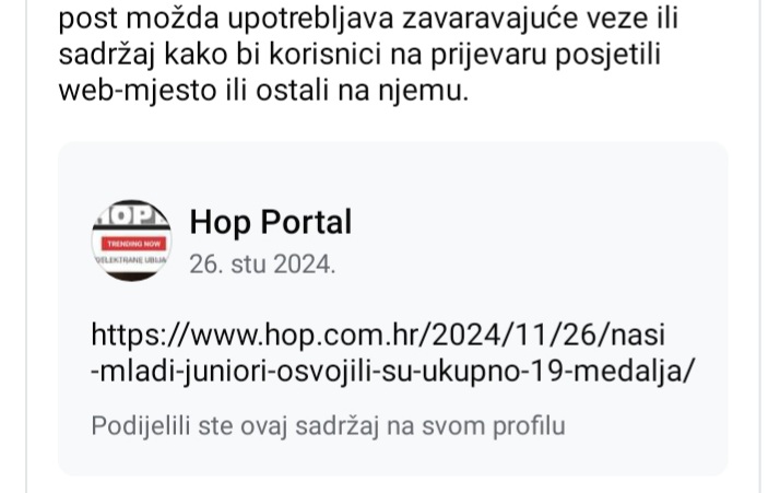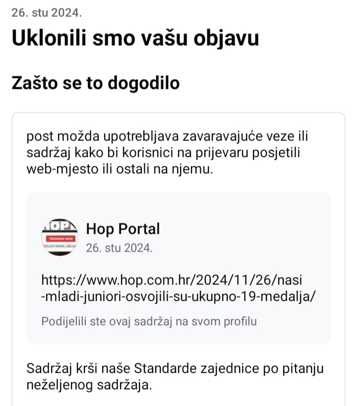 Neviđeno i skandalozno ponašanje Facebooka koji je zabranio na svojoj stranici tekst o velikom uspjehu hrvatskih brzoklizača u juniorskoj konkurenciji.Potpuno neshvatljivo da tekst i slike koje smo dobili marketinškim putem i zamoljeni smo za objavu, Facebook umjetna inteligencija ili neka teže poremećena osobnost iz osobne mržnje prema svakome hrvatskom uspjehu obrisala je tekst sa stranice koju koristi portal.