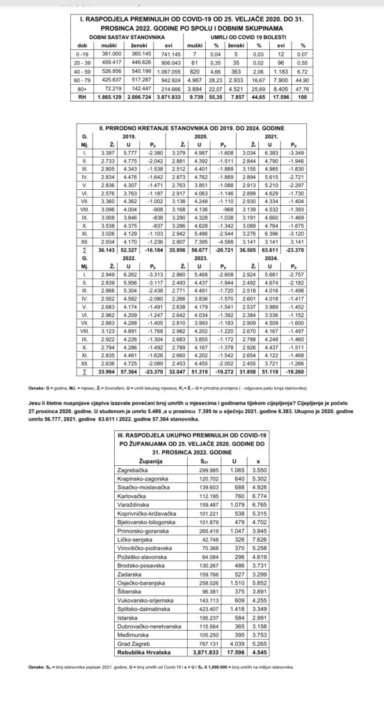 Od početka Covid-19 p(l)andemije do 29. srpnja 2022. godine u svijetu je bilo 577.419.168 pozitivnih na COVID-19 test odnosno oko 7,31% od svjetske populacije, a umrlo je 6.415.033 ili 1,11% od broja pozitivnih, a na milijun stanovnika svijeta umrlo je 812. U Hrvatskoj je do 24. srpnja 2022. godine bilo 1.177.711 pozitivnih na COVID -19 test ili 30,29% od broja stanovnika popisanih 2021.godine, a umrlo je 16.251 odnosno 1,38% od broja pozitivnih ili na milijun stanovnika 4.179, a to je 5,15 puta više od svjetskog prosjeka. Prosječna dob ukupno umrlih od početka COVID – 19 – p(l)andemije do 24. srpnja 2022. godine u Hrvatskoj iznosi oko 76 godina. Očekivano trajanje života od 2011. do sredine 2020. godine kretalo se između 76,9 i 78,5, a sredinom 2020. godine bilo je 78,8 godina. Ukupni broj umrlih do 24.srpnja kod dobnih skupina mlađih od 60 godina bilo je 1.234 ili 7,6% od ukupno umrlih od ili s COVID-19, a broj pozitivnih je bilo 959.490 ili 81,47% od ukupno pozitivnih. Smrtnost je iznosila 0,13% i broj mrtvih na milijun stanovnika 455. Za dobne skupine starije od 59 godina ukupni broj umrlih je 15.017 ili 92,4%, a pozitivnih je bilo 218.221 ili 18,53%. Smrtnost je iznosila 6,88% i broj umrlih na milijun stanovnika 12.973. U II. priloženoj tablici dani su podatci za prirodno kretanje stanovnika od 2019. do 2024. godine.