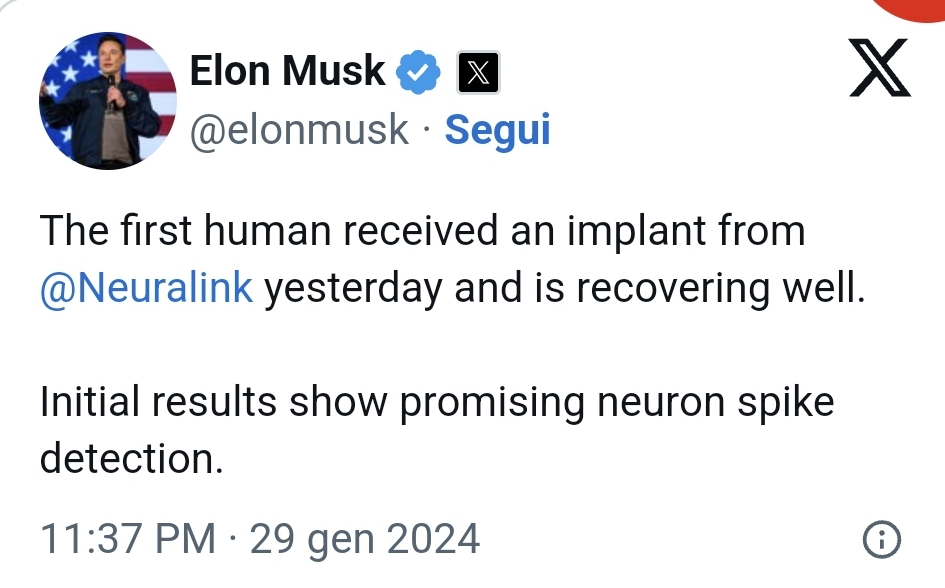 To je najavio isti poduzetnik u postu koji se pojavio na X.com (društvena mreža koju je kupio 2022. godine kada se zvao Twitter), pisajući: “Prvi čovjek je jučer (nedjelja 28. siječnja 2024.) primio čip od Neuralinka i dobro se oporavlja. Početni rezultati pokazuju obećavajuće otkrivanje neuronalnih vrhova”.