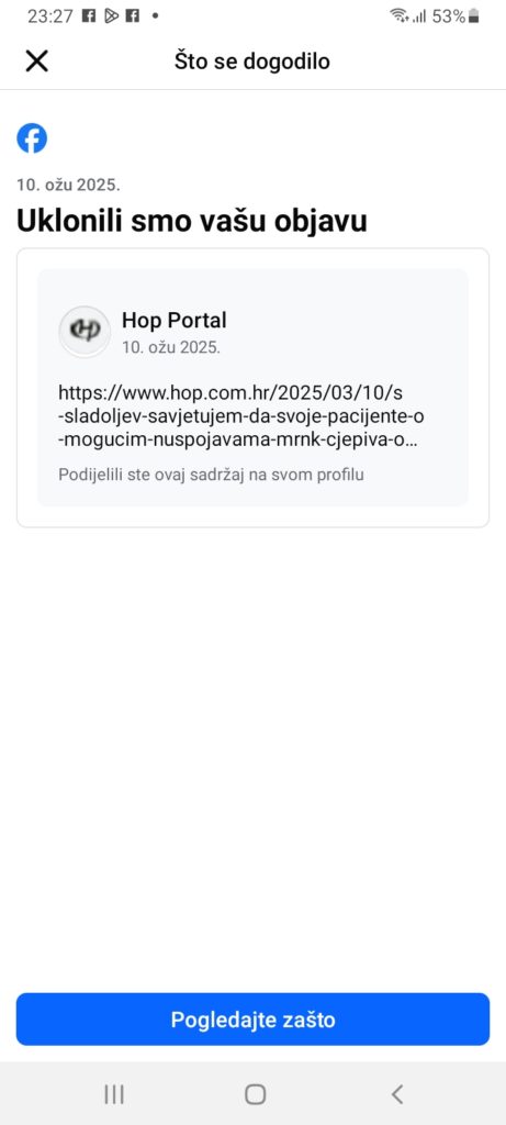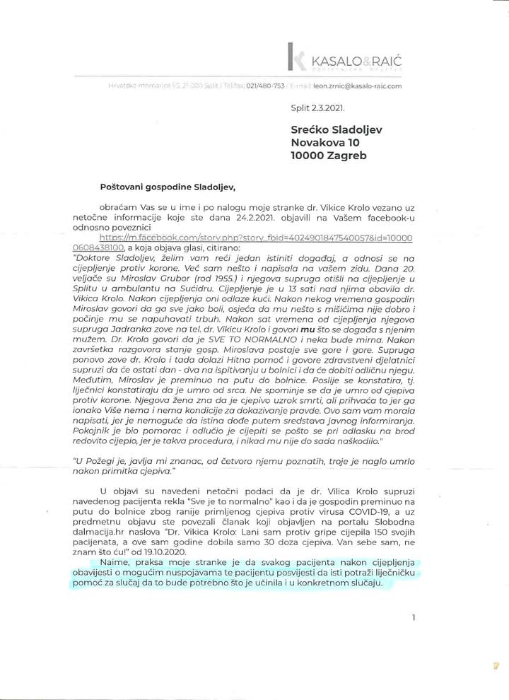 Predsjednica KOHOM-a i zamjenica predsjednika Hrvatske liječničke komore zatražila je da uklonim objavu od 24.2. zbog navodno „netočnih informacija kojima sam povrijedio njenu osobnost i nanio joj štetu.“ Kao netočno navodi kako supruzi čovjeka kojem je pozlilo i koji je preminuo nakon što ga je cijepila, nije po telefonskom pozivu odgovorila da je, cit. „sve to normalno“. Što je točno rekla, ne navodi. Ali nešto je morala odgovoriti? Zar nije logično da je ipak rekla nešto što će ženu umiriti?