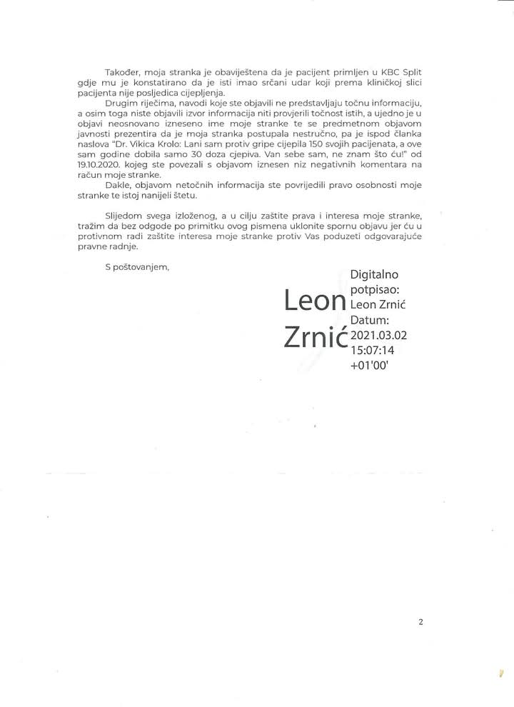 Poštovana dr Krolo. Umjesto da me napadate, u interesu struke i svojih pacijenata čitajte i razmišljajte o onome što objavljujem. Preko KOHOMa (gdje ste predsjednica) i Hrvatske liječničke komore (gdje ste zamjenica), urgirajte u vrhu države, da dopuste da u medije dođu i oni koji o imunologiji, cjepivima pa i fiziologiji znaju mnogo više od vas.