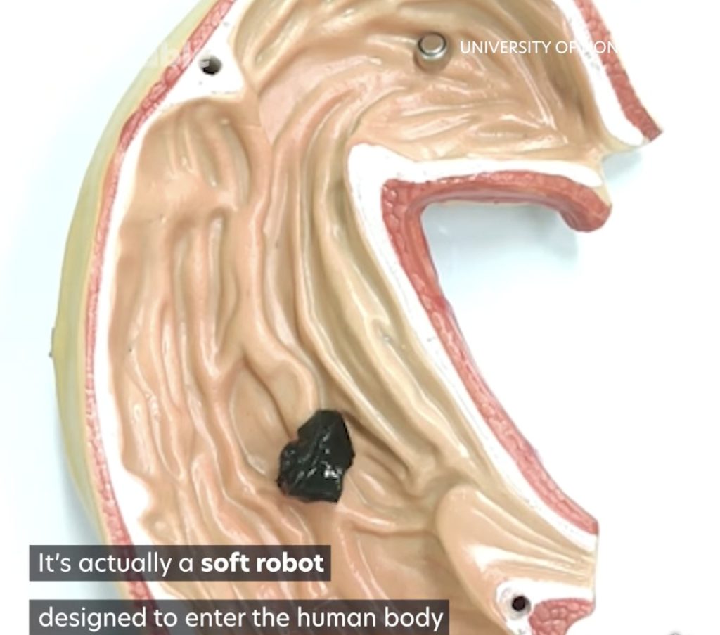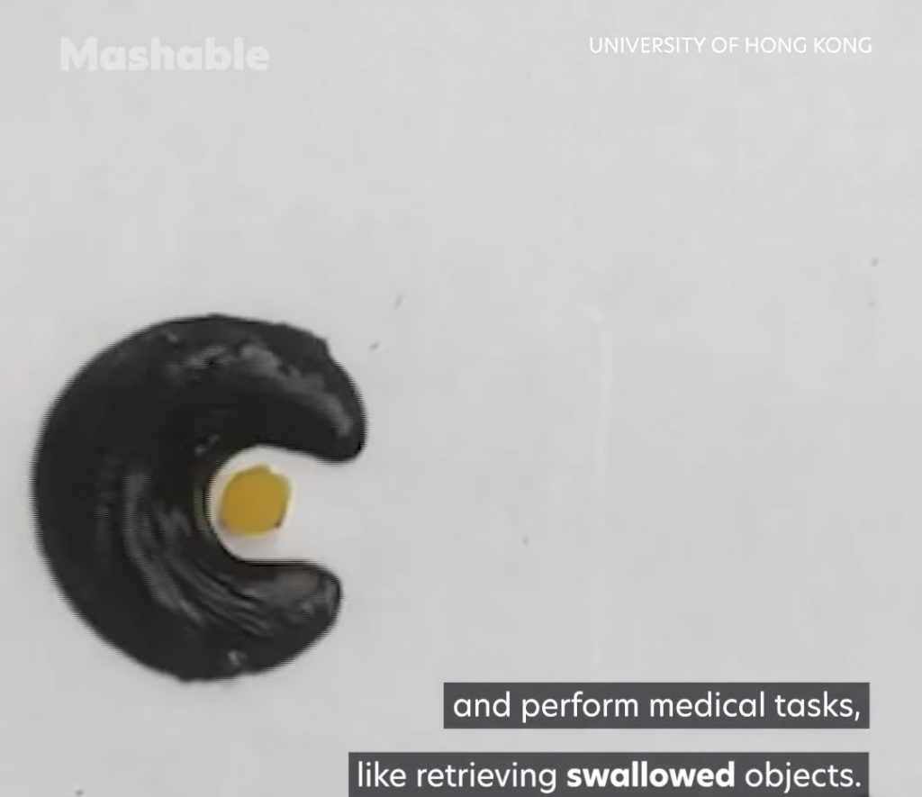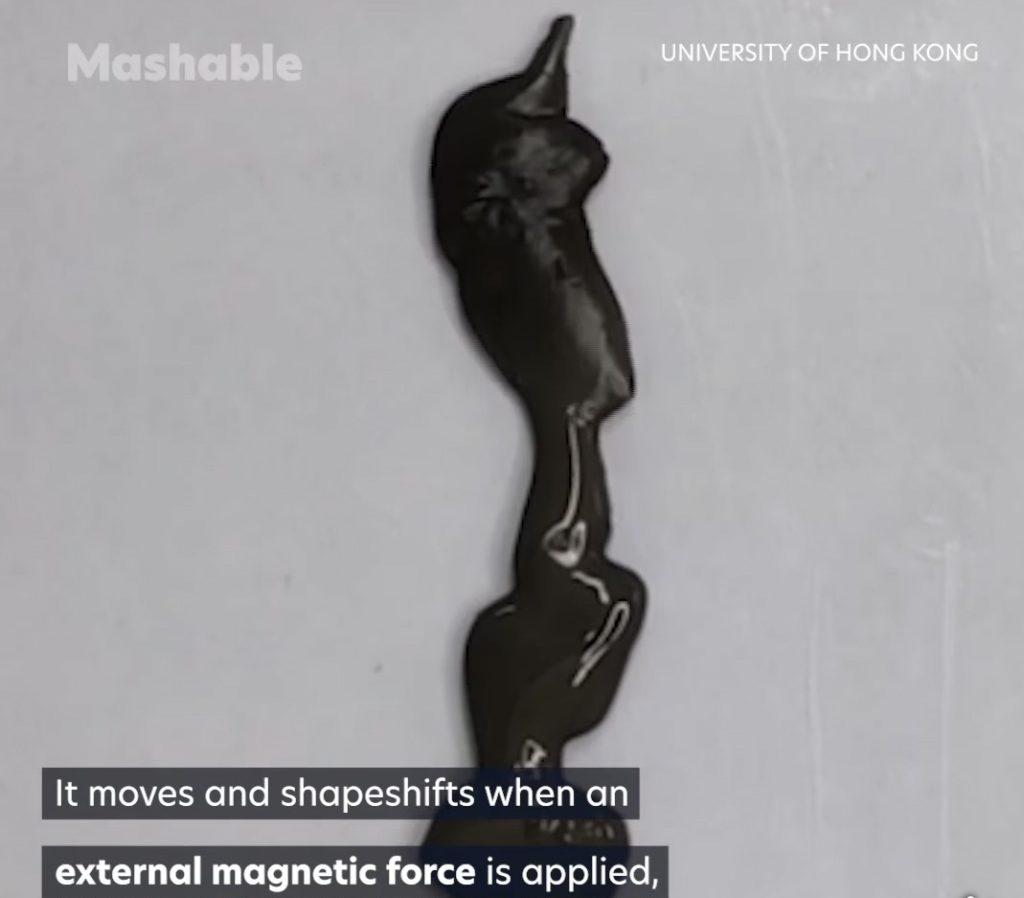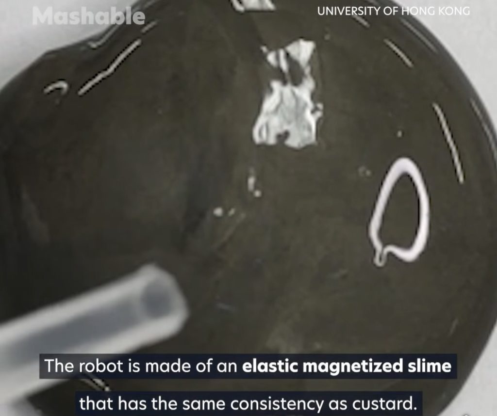 Istraživači s Kineskog sveučilišta u Hong Kongu stvorili su ljigavog mekanog robota dizajniranog da uđe u ljudsko tijelo. Bot se sastoji od sluzi koja sadrži magnetske čestice kojima se može manipulirati pomoću vanjskih magneta.