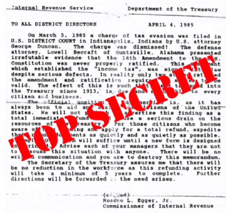 16. amandman, koji je Poreznoj upravi navodno dao ovlast da oporezuje vaš dohodak (SAD), NIKAD nije ZAKONSKI RATIFICIRAN. Prema zataškanom internom dopisu povjerenika Porezne uprave iz 1985., cijeli porezni sustav temelji se na ustavnoj prijevari.