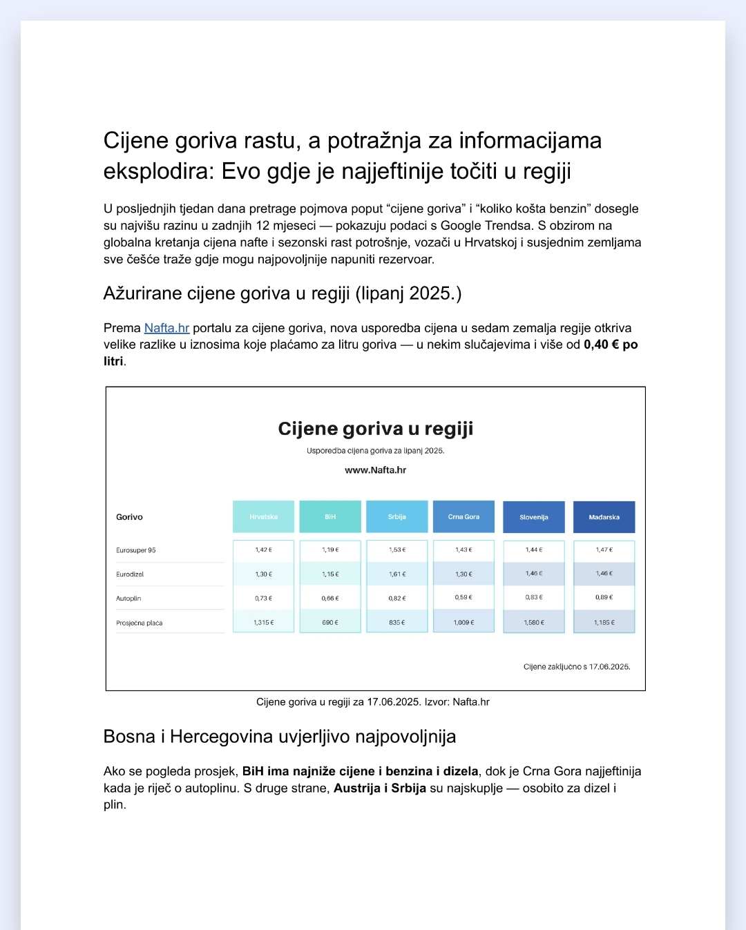 Usporedili smo cijene Eurosupera 95, dizela i autoplina u 7 zemalja regije: Hrvatska, BiH, Srbija, Crna Gora, Slovenija, Mađarska i Austrija. Rezultati pokazuju iznimno velike razlike — čak do 0,40 € po litri, što znači i uštede od 20+ eura po spremniku za pametno planirane vožnje.