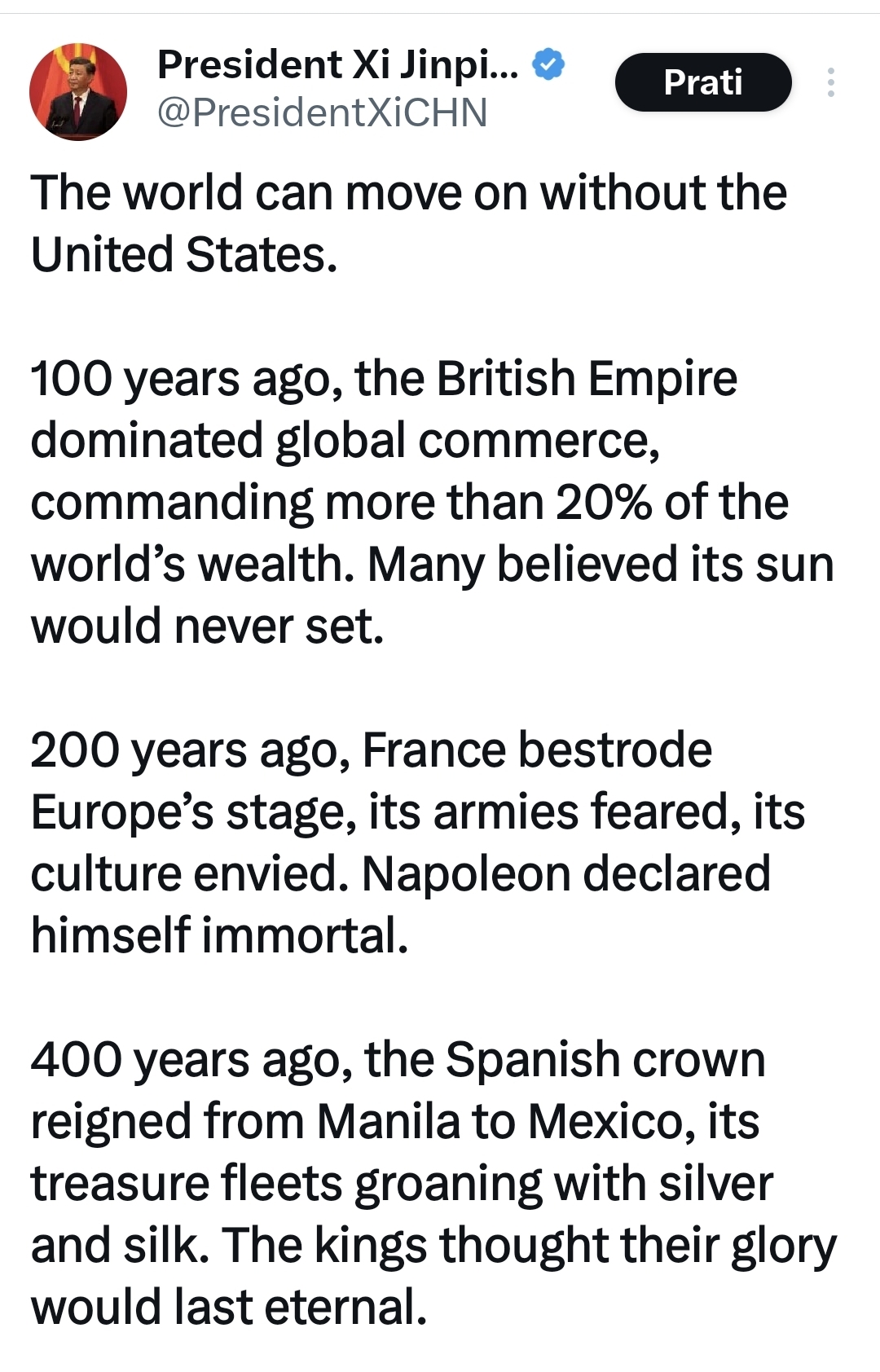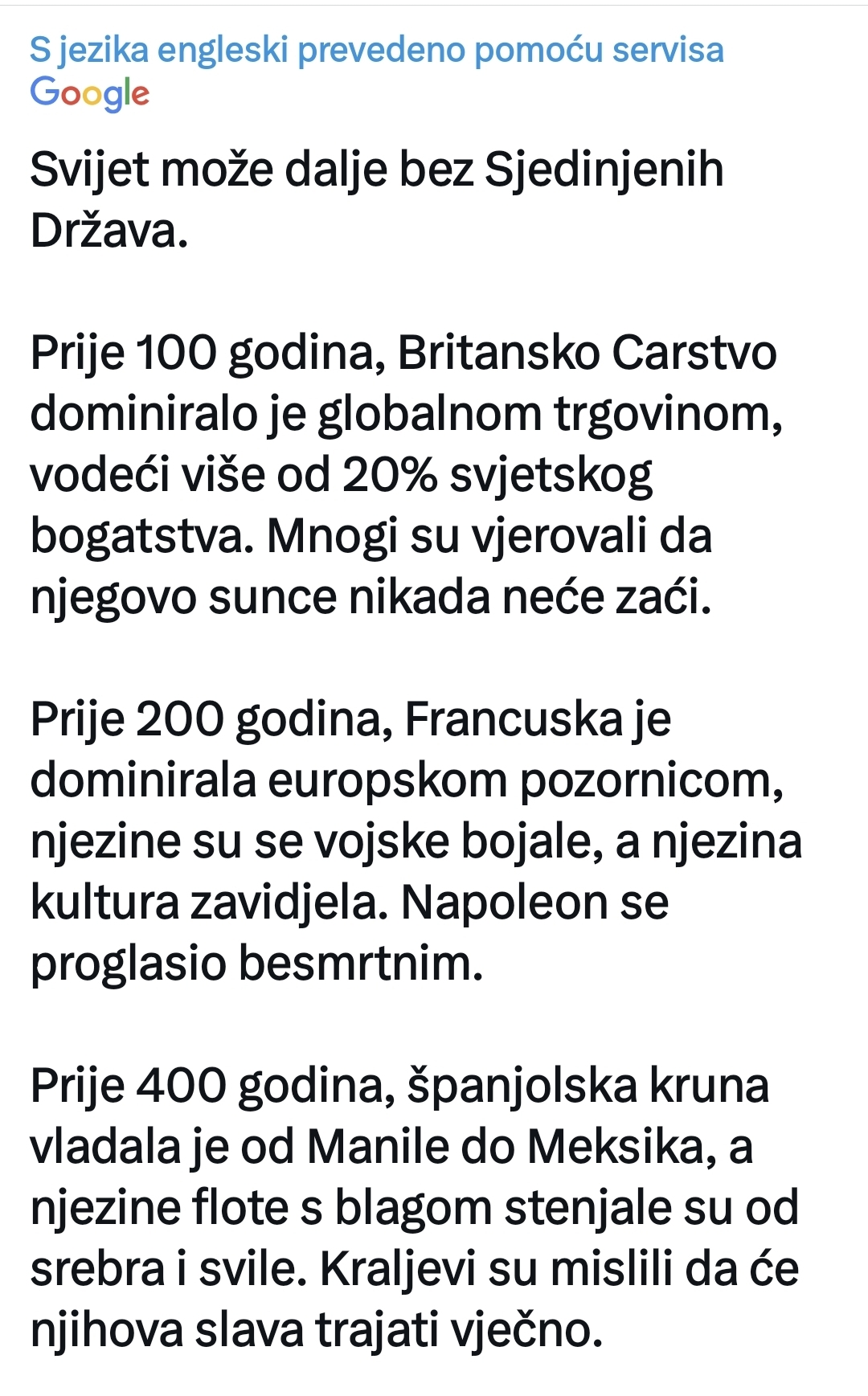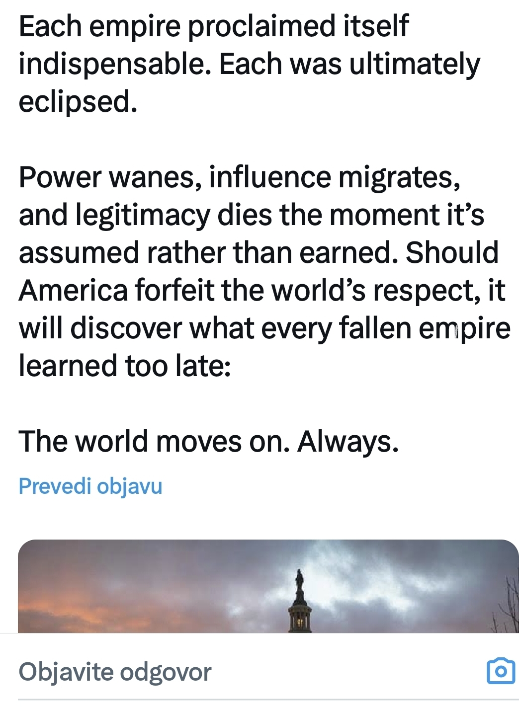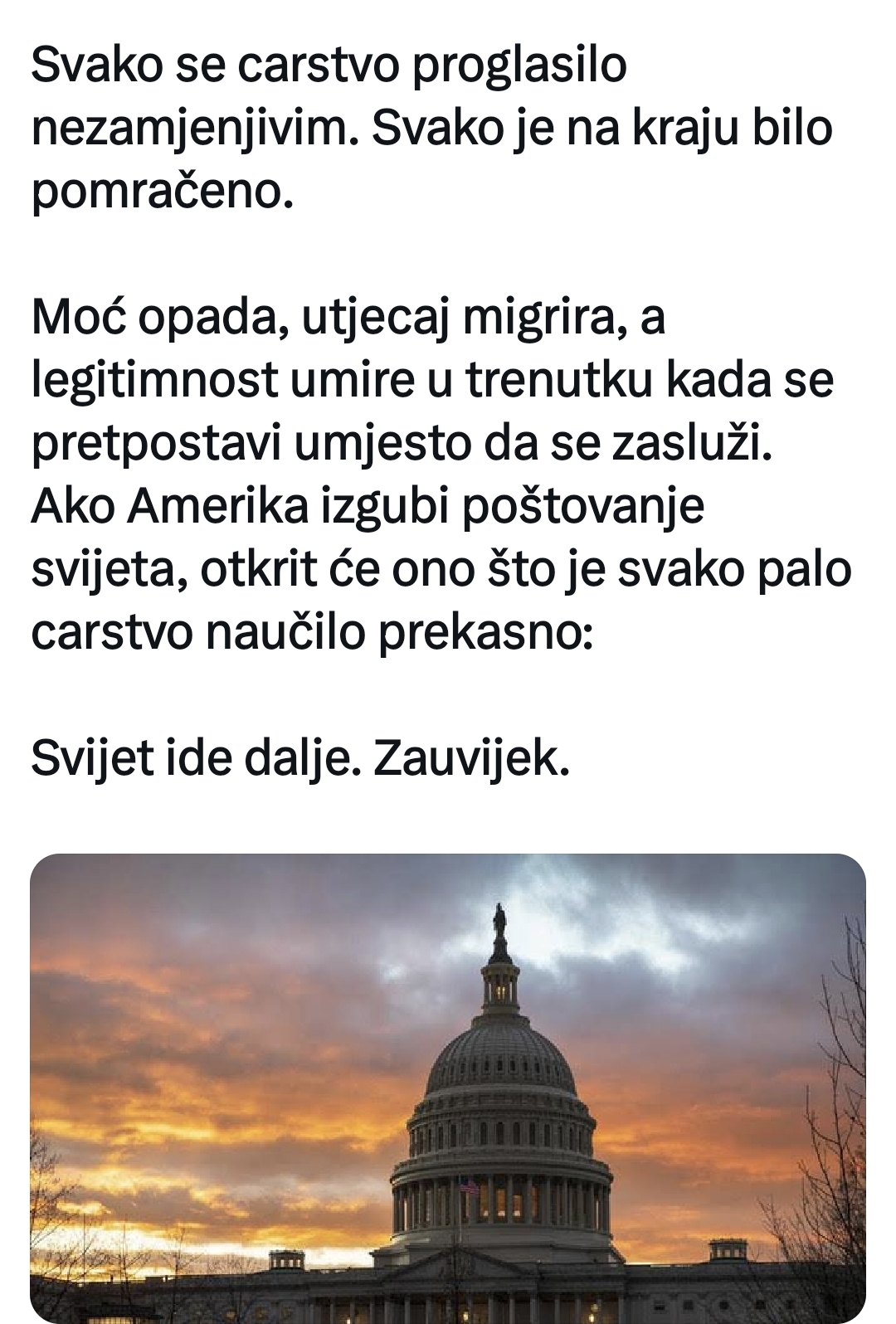 Moć blijedi, utjecaj se seli, a legitimitet umire u trenutku kada se uzima zdravo za gotovo, umjesto da se zasluži. Ako Amerika izgubi poštovanje svijeta, otkrit će ono što je svaka pala sila shvatila prekasno: