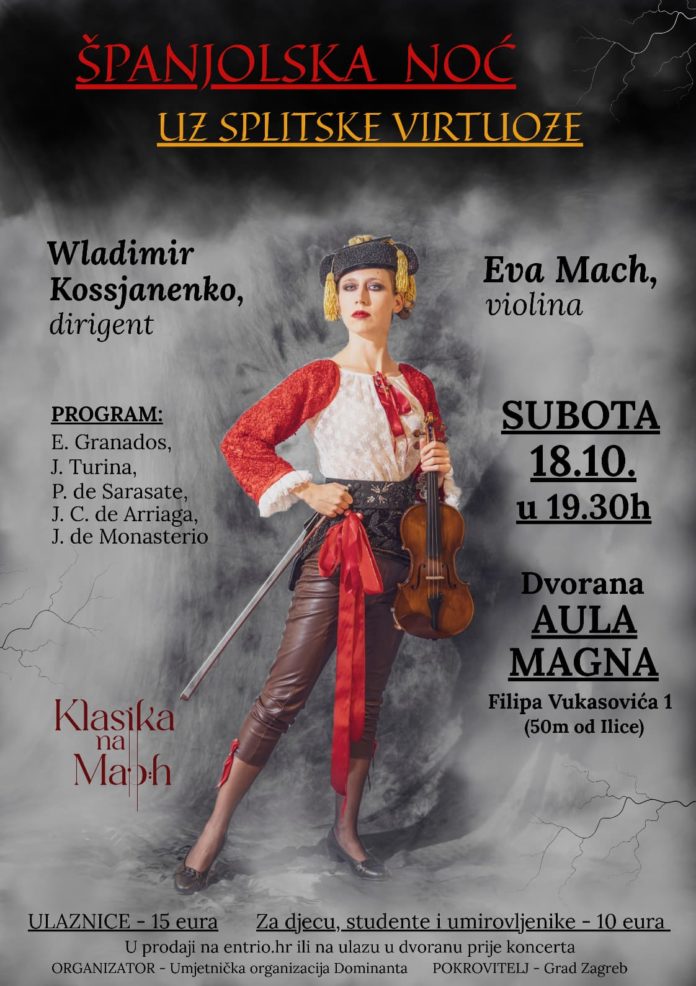 Vrhunac ovogodišnjeg koncertnog ciklusa Klasika na Mach je gala koncert pod nazivom Španjolska noć uz Splitske virtuoze, s vrlo atraktivnim program posvećenim španjolskim skladateljima 19. i ranog 20. stoljeća – od lirskog Intermezza iz ciklusa Goyescas Enriqua Granadosa i sugestivne La Oración del Torero Joaquína Turine, preko melankoličnog oproštaja s Alhambrom Jesúsa de Monasterija, do vatrenih Ciganskih melodija i briljantne Carmen Fantazije Pabla de Sarasatea. Mali odmor od temperamentnih i strastvenih taktova pruža obrada Gudačkog kvarteta br. 1 u d-molu Juana Crisóstoma de Arriage, genija kratkog života ali velike glazbene inspiracije zbog koje nosi nadimak španjolskog Mozarta.