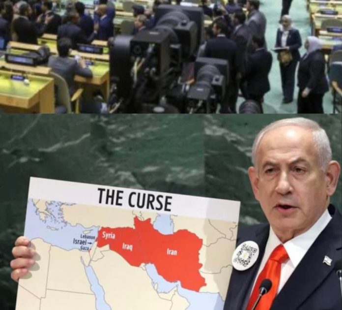 U trenutku kada je ratni zločinac Benjamin Netanyahu izašao na pozornicu, velika većina svjetskih delegacija napustila je publiku i otišla, usred zvižduka izraelskom premijeru.