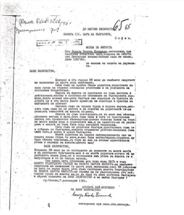 Ovo je dokument za pomilovanje mladog Lazara , bugarskog ministra vojske generala Theodosja Daskalova (unuk poznatog Bacha Kira, ubijen 1. veljače 1945. godine nakon presude našeg rođenog narodnog suda).