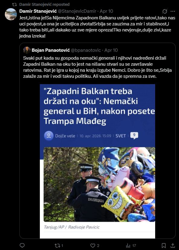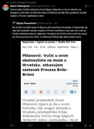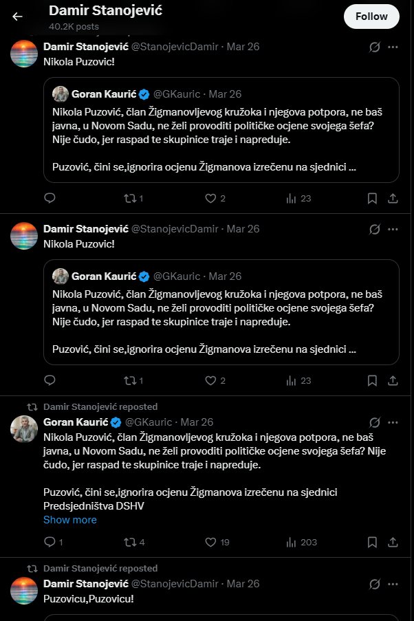 Naime, u nizu prijašnjih osvrta neizostavno je bilo spomenuti i notornog Damira Stanojevića, koji se predstavlja u javnosti (X profil) kao „dopredsjednik mjesnog odbora Novi Sad Demokratskog saveza Hrvata u Vojvodini (DSHV)” te kao „master i kustos povjesničar”.