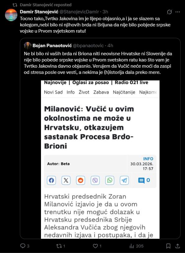 Nakon tvrdnji dotičnog da „(hrvatskih) Brijuna ne bi bilo bez pobjede srpske vojske u Prvom svjetskom ratu!” – prilažem još jedan vizual (eng. screenshot) kao dokaz postojanja kontinuiteta pri iznošenju (n)ovih pseudo opservacija.