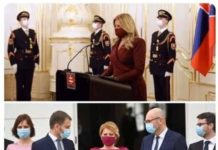 Slovačka predsjednica Zuzana Čaputová, s maskicom u boji odjevne kombinacije. U odjevnom.stilu slična Kolindi Grabar Kitarović od koje je mlađa 6 godina.